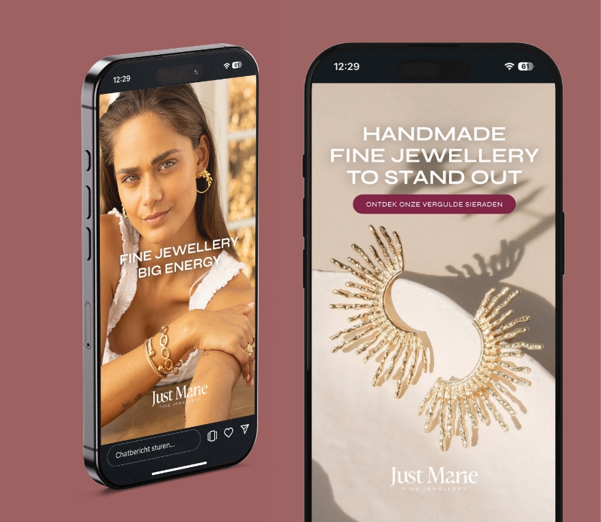 Voor sieradenlabel Just Marie ontwikkelden we een rebranding die de kern van het merk opnieuw tot leven brengt: stijlvol, zelfverzekerd en moeiteloos chic. Wat begon als een liefde voor bijzondere oorbellen groeide uit tot een sieradenmerk met een eigen signatuur – handgemaakt door een meester-goudsmid op Bali, ontworpen door founder Marina met oog voor detail en persoonlijkheid. Daarnaast bouwden we met Studio Marie een zustermerk dat de collectie aanvult met geselecteerde pieces die elke look compleet maken. Twee lijnen, één visie.