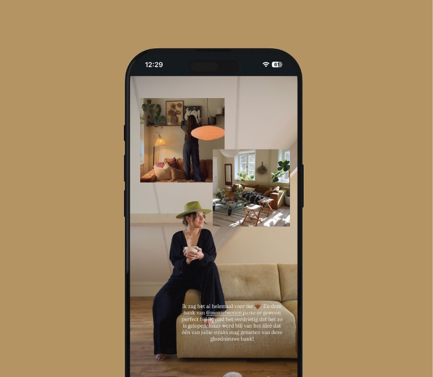 Voor Montèl zetten we een reeks stijlvolle influencer-samenwerkingen op met één helder doel: een jongere en grotere doelgroep bereiken. Vanuit het overkoepelende concept ‘Jouw Montèl, Jouw Moment’ gingen we op zoek naar creators met een passie voor interieur, een betrokken community en een eigen, herkenbare stijl. Zij ontvingen een Montèl-bank die helemaal bij hun woon- en lifestyle past, en verrasten ons met unieke, authentieke content die het merk een flinke eigentijdse boost gaf.