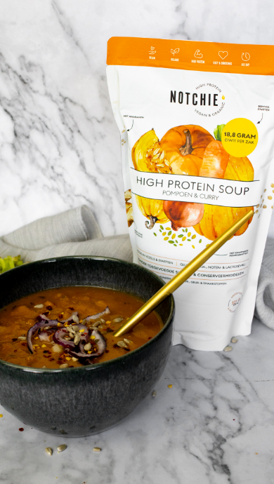 Toen we de oprichtster van Notchie leerden kennen, was ze bezig met haar eerste high-protein, groenterijke maaltijdsoepen. Onder het motto ‘Met gemak al je eiwitten en groenten in één zak’, biedt het merk volwaardige, vegan, ready-to-eat producten die inmiddels verkrijgbaar zijn bij iedere grote supermarkt. Een merk waar wij direct enthousiast van werden! Vanaf het begin stonden wij klaar om Notchie te ondersteunen met een uniek branding- en lanceringsproject.